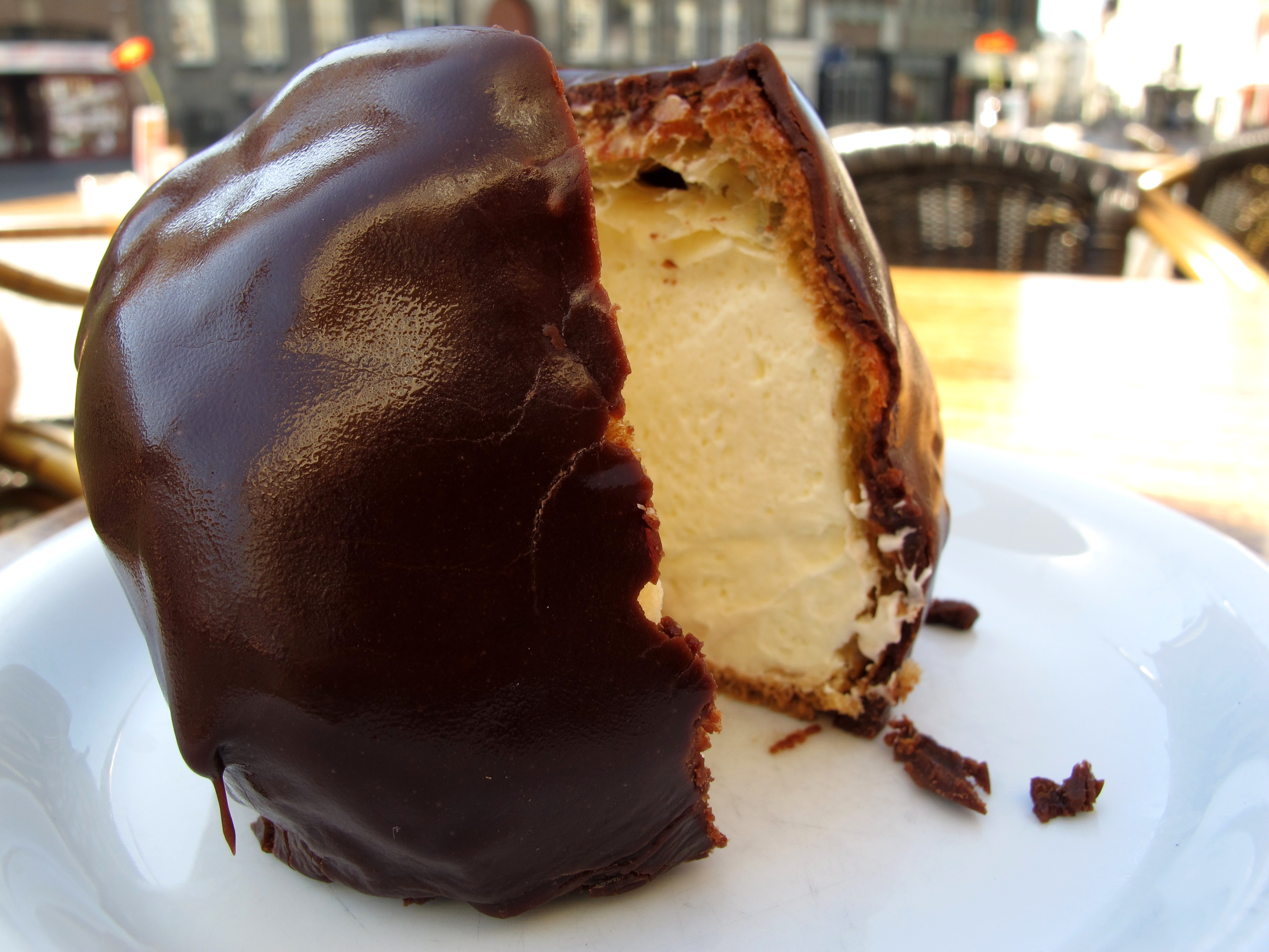 People queue for Bossche bollen (chocoladebollen) and after eating one of the giant cream filled chocolatey pastry balls of deliciousness, I can see why!