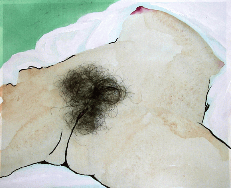 Cash Brown, Joan and Pierre, 2008, mixed media with pubic hair on paper, 15 x 17 cm