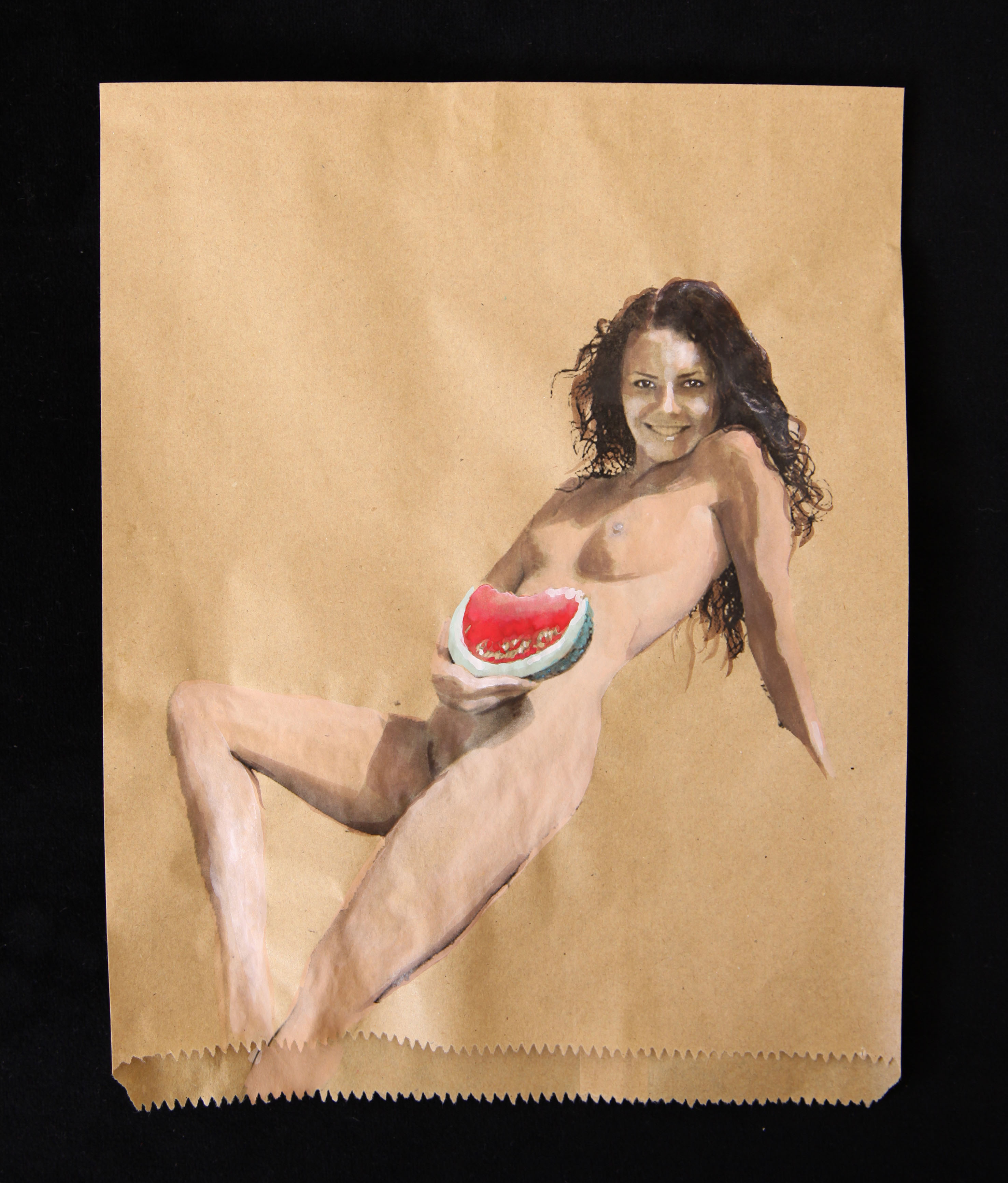 Cash Brown_Nice Melon_laser print, gouache, graphite, ink on brown paper lunch bag_245 x 202 mm_2013