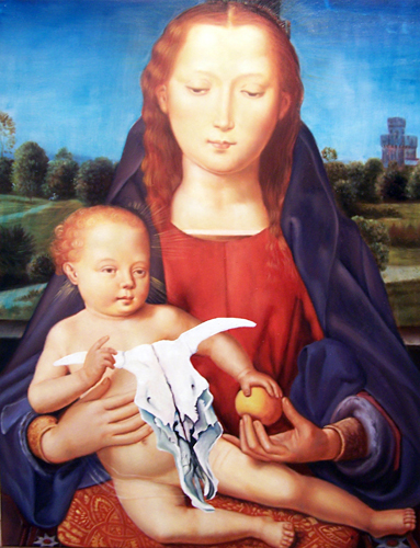 Madonna and Child with a Skull ( after Hans Menling and Georgia O’Keefe), 2010, oil on canvas, 50.8 x 71.1 cm