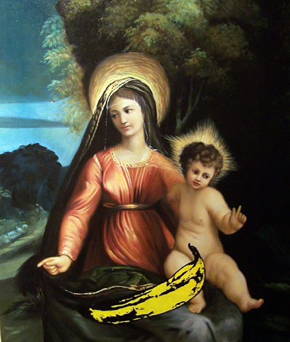 Madonna and Child with a Banana (after Dosso Dossi and Andy Warhol) 2010, oil on canvas, 50.8 x 58.4 cm